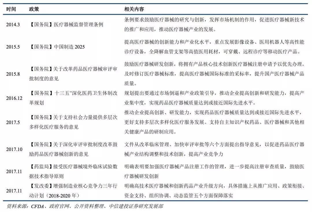 另外,《“十三五”醫療器械科技創新專項規劃 》以及《高端醫療器械關鍵技術產業化實施方案》的接連出臺,旨在依托創新能力強、規模效應明顯、具有國際視野的行業企業提升科技創新能力。
