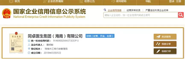 2018年3月5日,同卓醫(yī)生集團(tuán)(海南)有限公司經(jīng)海南省工商局核準(zhǔn)正式成立。