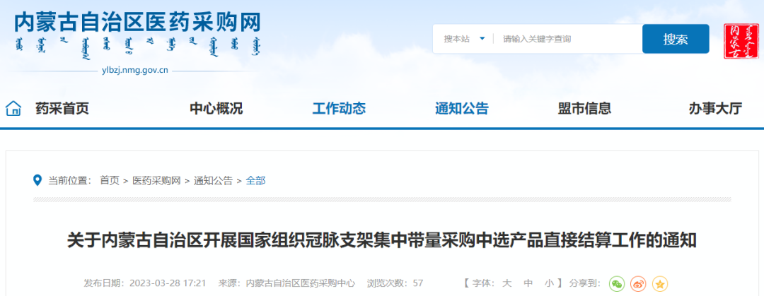 3月28日,內蒙古自治區醫藥采購網發布《關于內蒙古自治區開展國家組織冠脈支架集中帶量采購中選產品直接結算工作的通知》(以下簡稱《通知》)。