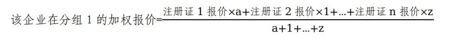 申報(bào)企業(yè)區(qū)分組別,按照注冊(cè)證分別進(jìn)行一輪報(bào)價(jià),同一分組內(nèi)一張注冊(cè)證報(bào)一個(gè)價(jià)格。注冊(cè)證報(bào)價(jià)同組套采購(gòu)模式一致,加權(quán)報(bào)價(jià)規(guī)則如下: