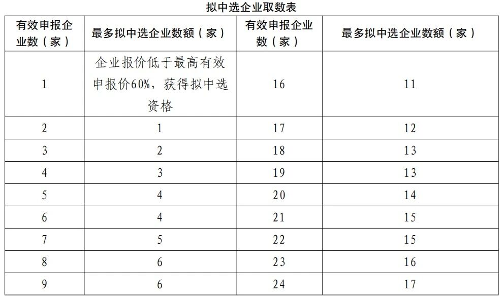 同一競(jìng)價(jià)單元內(nèi),依據(jù)申報(bào)企業(yè)報(bào)價(jià)由低到高進(jìn)行排名,按照擬中選企業(yè)取數(shù)表(下圖)確定擬中選企業(yè)。
