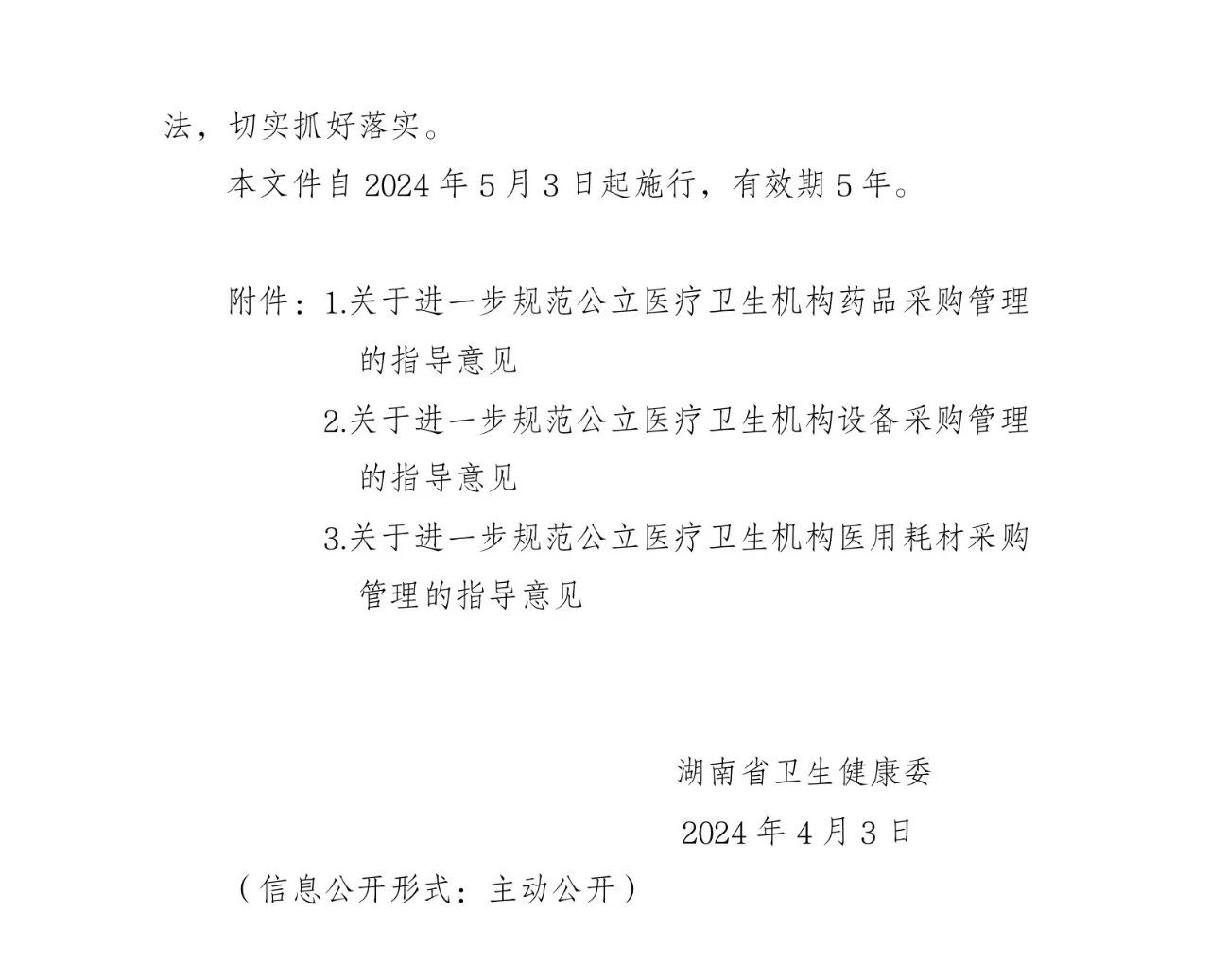 湖南省衛(wèi)健委分別制定了《關于進一步規(guī)范公立醫(yī)療衛(wèi)生機構藥品采購管理的指導意見》《關于進一步規(guī)范公立醫(yī)療衛(wèi)生機構設備采購管理的指導意見》及《關于進一步規(guī)范公立醫(yī)療衛(wèi)生機構醫(yī)用耗材采購管理的指導意見》。
