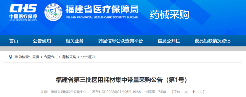 5月6日,福建省醫保局發布《福建省第三批醫用耗材集中帶量采購公告(第1號)》,將對冠脈導引導管類、冠脈導引導絲類、彈簧圈類、壓力泵類、圈套器(息肉勒除器)等5種耗材開展集中帶量采購。