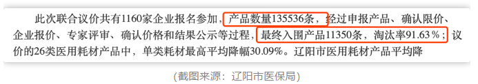 6月8日,遼陽市醫保局官網發布“遼陽市·營口市醫療衛生機構2020年醫用耗材聯合議價項目”的結果,內容顯示:本次共有1100余家企業參與報名,產品數量13萬余件,但最終入圍的產品僅有1.1萬余件,淘汰率接近92%。