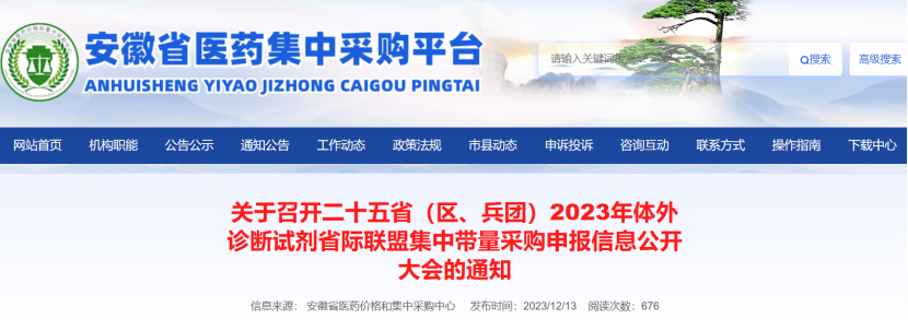 12月13日,安徽省醫藥價格和集中采購中心發布《關于召開二十五省(區、兵團)2023年體外診斷試劑省際聯盟集中帶量采購申報信息公開大會的通知》(以下簡稱《通知》)。
