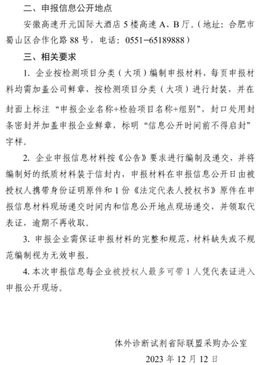 根據《通知》內容,二十五省(區、兵團)2023年體外診斷試劑省際聯盟集中帶量采購申報信息公開大會將在安徽高速開元國際大酒店5樓高速A、B廳舉行,申報信息材料現場遞交時間確定為2023年12月20日上午8:00-8:50,申報信息公開時間為同日上午9:20。