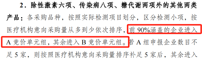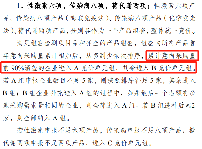 根據(jù)公告,本次聯(lián)盟集采將單檢測項目或組套檢測項目品種齊全項目按醫(yī)療機構(gòu)意向采購量分為 A、B 兩個競價單元,性激素六項、傳染病八項、糖代謝兩項三類產(chǎn)品分別按組套采購。