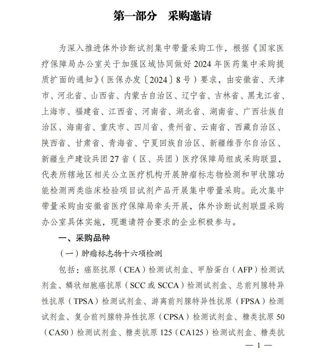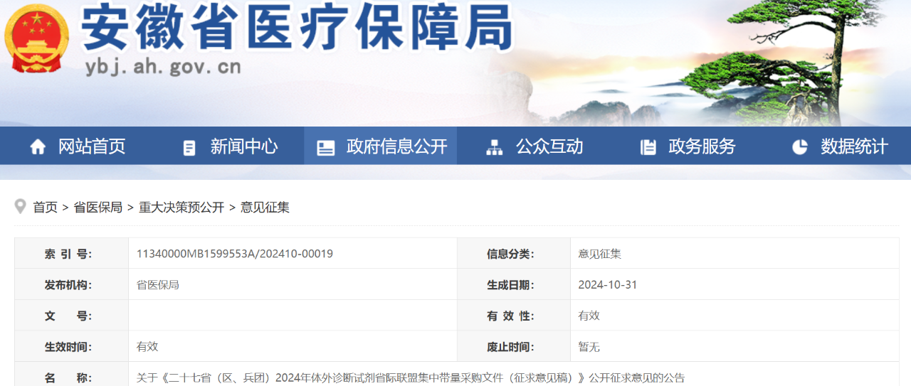 10月31日,安徽醫保局發布《二十七省(區、兵團)2024年體外診斷試劑省際聯盟集中帶量采購文件(征求意見稿)》(完整見文末)。