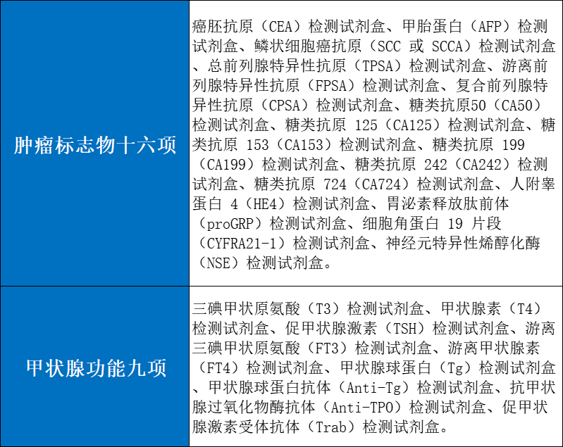 此次集采周期兩年,采購品種包括腫瘤標志物檢測產品十六項(化學發光法、流式熒光法、時間分辨免疫熒光法等)與甲狀腺功能檢測產品九項(化學發光法),具體如下: