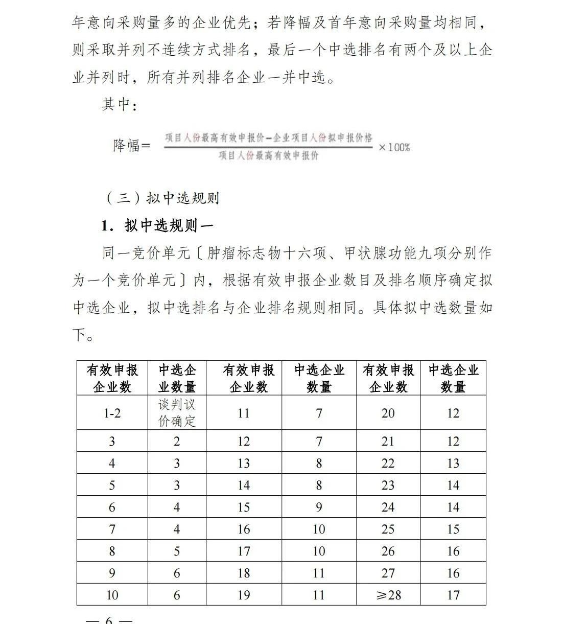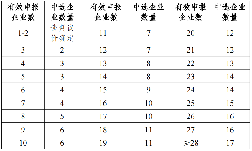 擬中選規則一:同一競價單元內根據有效申報企業數目及排名順序確定擬中選企業,具體擬中選數量如下: