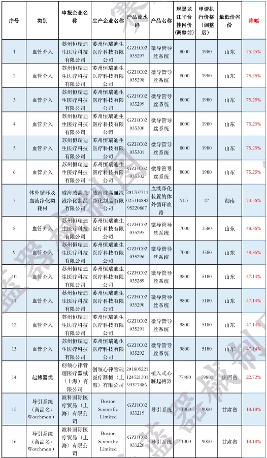 體外循環及血液凈化類最低降幅4.96%,最高降幅70.56%(聯動省份為湖南省),平均降幅37.76%;血管介入類最高降幅75.25%(聯動省份為山東省),平均降幅8.35%;