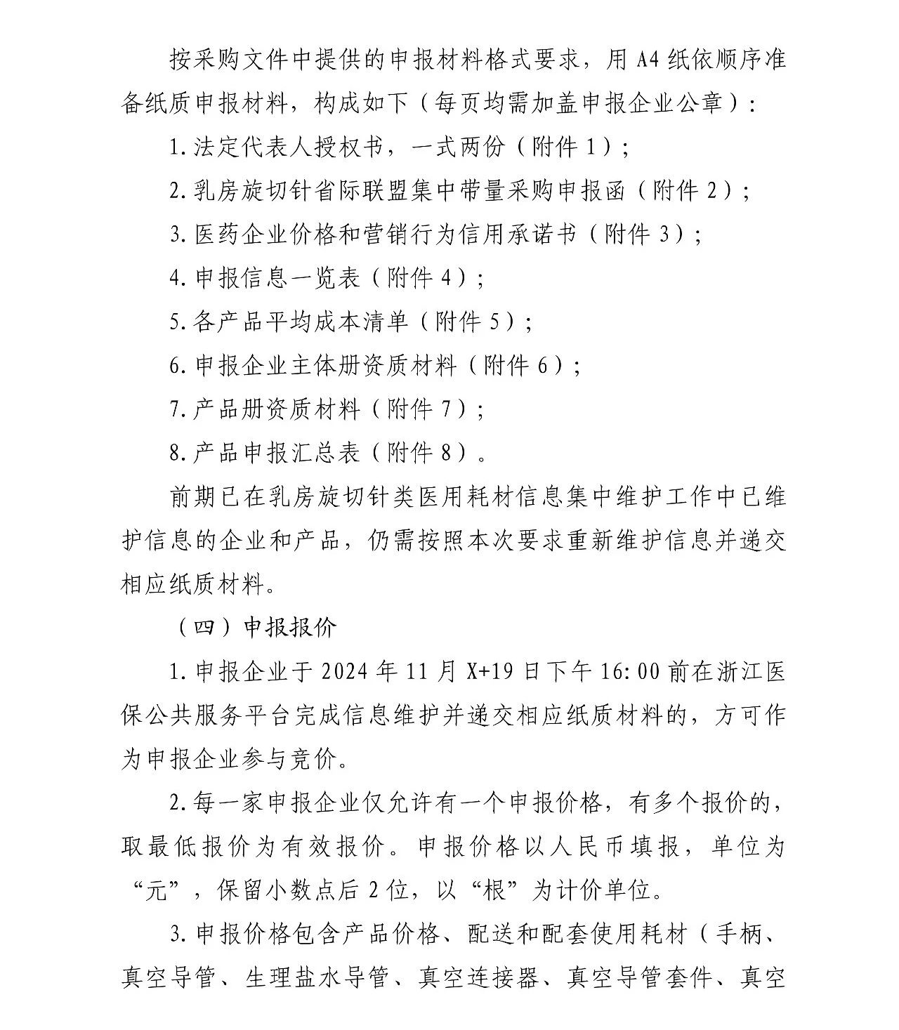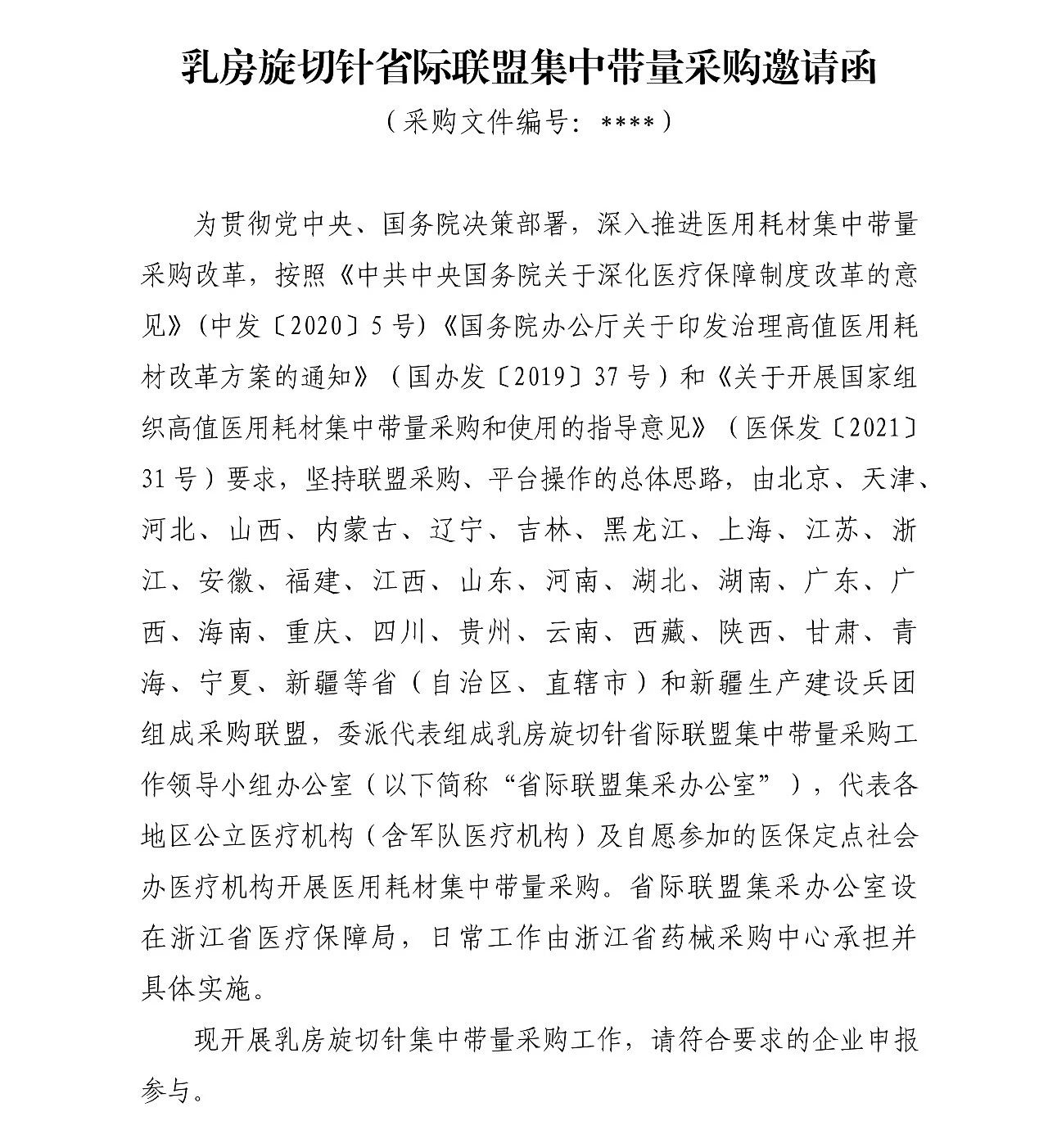 10月31日,浙江省就《乳房旋切針省際聯盟集中帶量采購文件(征求意見稿)》(全文見文末)公開征求意見,征求意見時間截止到11月6日。