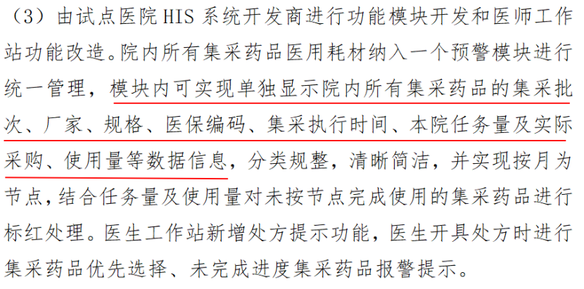 其中提出,探索開展二級及以上公立醫療機構建設院內集采預警系統試點,通過整合醫院庫房管理系統、醫療HIS系統、處方系統等多個系統的數據和功能,將所有集采藥品醫用耗材納入一個預警模塊進行統一管理,增加集采產品使用情況報警提示功能,加強集采產品使用監管。