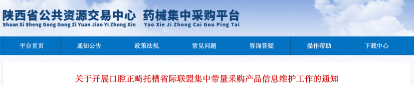 8月22日,陜西公共資源交易中心發布《關于開展口腔正畸托槽省際聯盟集中帶量采購產品信息維護工作的通知》。