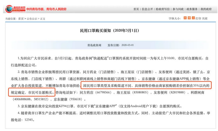 不止南通市,青島市政務網發布了“民用口罩購買須知”,消息指出,因民用口罩類型及采購渠道不同,具體銷售價格由商家按購銷差價控制在35%以內的規定確定,市民可自愿購買。
