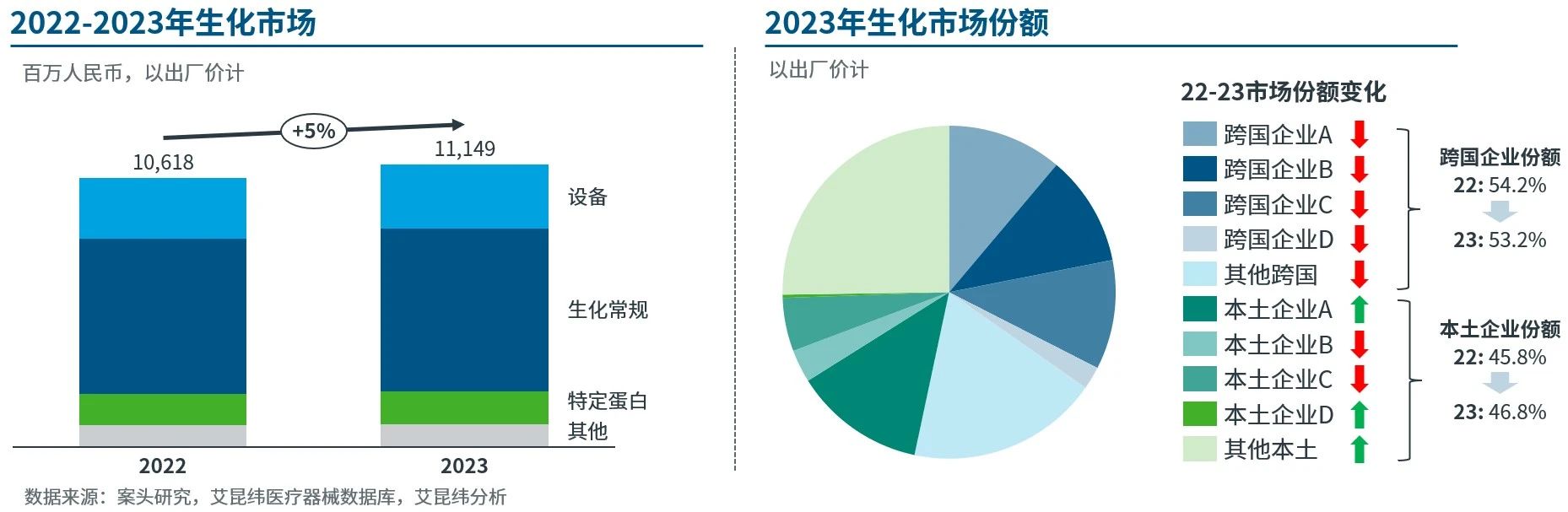 基于大規(guī)模集采影響,生化試劑國產(chǎn)替代趨勢明顯。根據(jù)IQVIA艾昆緯數(shù)據(jù),2023年化市場跨國與本土廠商份額接近持平,跨國企業(yè)份額較2022年呈下降趨勢。在國產(chǎn)替代大環(huán)境影響下,終端醫(yī)院持續(xù)增加本土廠商產(chǎn)品采購比例。伴隨江西省聯(lián)盟集采的深化及采購范圍擴(kuò)張,本土企業(yè)市場份額預(yù)計將進(jìn)一步擴(kuò)張。
