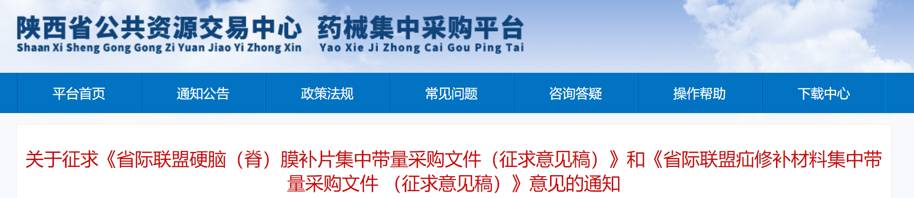 12月7日,陜西省公共資源交易中心發布關于征求《省際聯盟硬腦(脊)膜補片集中帶量采購文件(征求意見稿)》和《省際聯盟疝修補材料集中帶量采購文件 (征求意見稿)》意見的通知,征求時間為2023年12月7日至2023年12月11日17:00止。