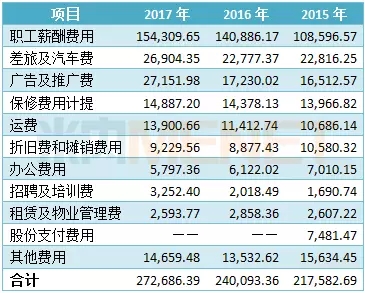 邁瑞醫(yī)療的銷售費(fèi)用主要由職工薪酬費(fèi)用、差旅及汽車費(fèi)、廣告及推廣費(fèi)等構(gòu)成。近年,其銷售費(fèi)用均超過20億,2017年達(dá)27.27億元,占營收比例24.40%。
