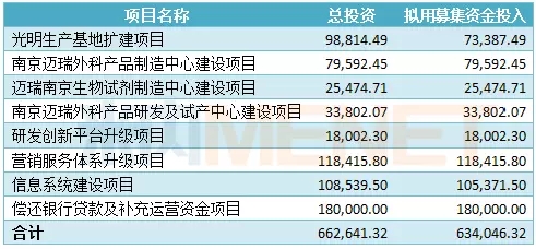 據(jù)招股說明書顯示,邁瑞醫(yī)療上述項(xiàng)目總投資額66.26億元,預(yù)計(jì)使用募集資金凈額63.40億元。本次募集資金投資項(xiàng)目將在現(xiàn)有主營業(yè)務(wù)的基礎(chǔ)上進(jìn)行擴(kuò)產(chǎn),進(jìn)一步突破現(xiàn)有產(chǎn)能瓶頸、改進(jìn)生產(chǎn)工藝、豐富產(chǎn)品和提升產(chǎn)品質(zhì)量,進(jìn)一步提升公司的業(yè)務(wù)規(guī)模和市場地位;而擴(kuò)建外科產(chǎn)品研發(fā)及試產(chǎn)中心、升級(jí)研發(fā)創(chuàng)新平臺(tái),可提升技術(shù)開發(fā)實(shí)例,為公司的新產(chǎn)品研發(fā)提供更好的創(chuàng)新平臺(tái);升級(jí)營銷服務(wù)體系、進(jìn)行信息化系統(tǒng)建設(shè)等,有利于深挖市場、拓寬銷售渠道,推動(dòng)公司持續(xù)健康的發(fā)展。