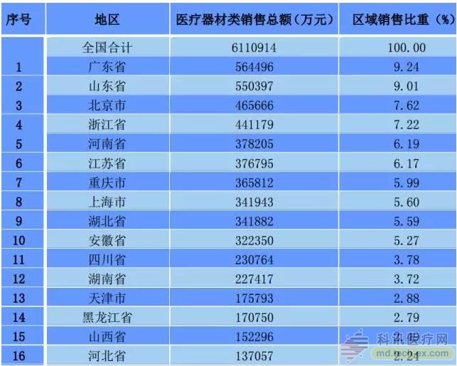 2016年,全國(guó)醫(yī)療器材類商品銷售總額約為611億元。廣東、山東為前兩大醫(yī)療器材銷售大省,北京、浙江、河南、江蘇、重慶、上海、湖北、安徽也進(jìn)入了區(qū)域銷售額排行榜的前10名。