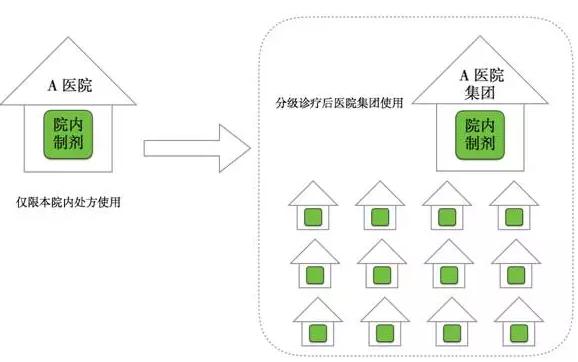 1、 分級診療的推行,醫院開始集團化,在上級醫院治療、在下級醫院康復,那么院內制劑不限于一家醫院來處方,在整個醫院集團內使用。很可能在網絡內的社區醫院都可以使用原先在大醫院才能處方的優質的院內制劑藥品。
