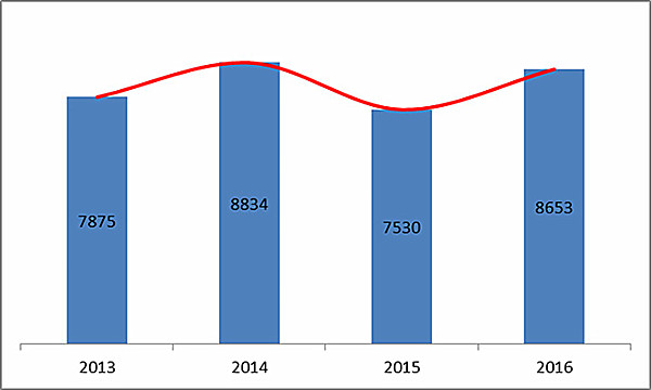 2016年,食品藥品監(jiān)管總局共批準(zhǔn)醫(yī)療器械注冊、延續(xù)注冊和許可事項(xiàng)變更注冊8653項(xiàng)。與2015年相比注冊批準(zhǔn)總數(shù)量增長14.9%。