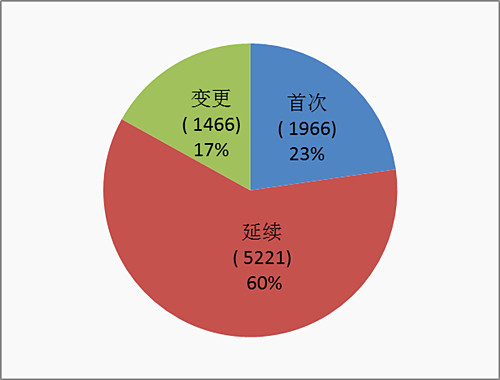 按照注冊式形區(qū)分,首次注冊1966項(xiàng)占全部注冊的23%,延續(xù)注冊5221項(xiàng)占全部注冊申請的60%,許可事項(xiàng)變更注冊1466項(xiàng)占全部注冊申請的17%。注冊形式比例情況見圖6。