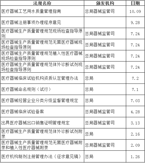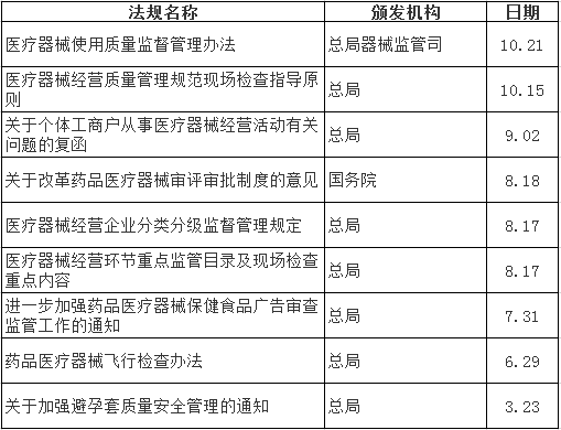 2014年-2015年,在行業(yè)母法國務院《醫(yī)療器械監(jiān)督管理條件》歷經10年修改終于落地的背景下,CFDA在醫(yī)療器械監(jiān)管上先后出臺了多項政策。據(jù)不完全統(tǒng)計,2015年1月以來,由總局及醫(yī)療器械監(jiān)管司出臺的醫(yī)療器械政策征求意見稿至少有14項,由國務院及總局出臺的醫(yī)療器械法規(guī)、部門規(guī)章和規(guī)范范性文件,多達20余項,比較重要的有9項。