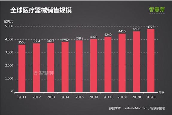根據EvaluateMedTech的統計,2011-2015全球醫療器械銷售規模呈現穩步上升趨勢。2015年,銷售額達到3900億美元以上。預計該市場規模在2020年增長至4775億美元,2015-2020期間將呈現4.1%的年均復合增長率。
