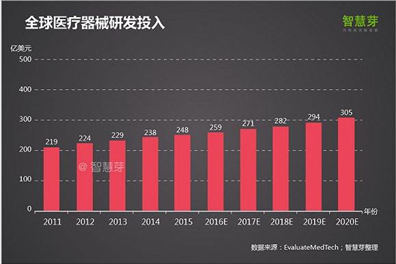 與此同時,全球醫療器械市場的研發投入也保持著穩定增長態勢,2015年達到248億美元。