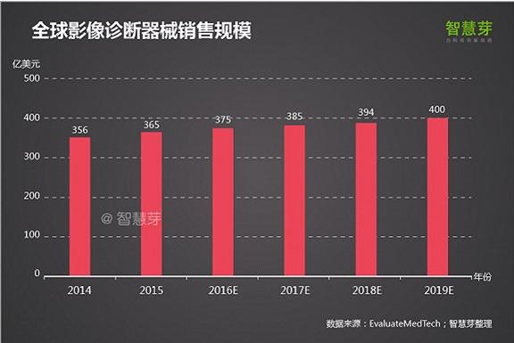 全球醫療器械市場中,影像診斷設備約占10%的份額。隨著人們越來越重視對慢性疾病的預防,影像診斷設備市場規模也在不斷擴大。2016年全球影像診斷設備銷售額達365億美元,預計2019年市場銷售將達到400億元。
