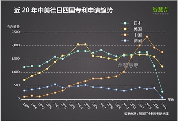 3.近20年中美日德四國的專利申請趨勢(圖表最好改大一點,并把幾個國家代碼改為國家名稱。如:jp-日本,us-美國,cn-中國,de-德國)