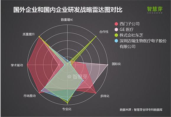 本次分析中我們以深圳邁瑞公司為例,對比國內企業與國外“三巨頭”德國西門子,美國通用和日本東芝公司在高端影像醫學設備領域的專利的多項指標進行對比,從而挖掘出國內企業和國外巨頭相比,在研發策略上的異同。
