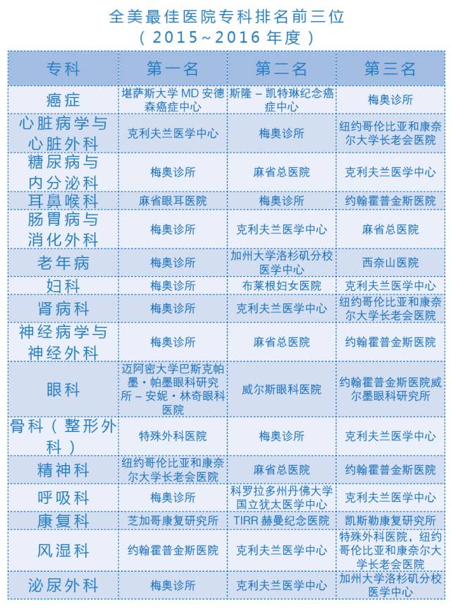 在2015~2016年度的全美最佳醫院排行榜中,137家醫院——不足全美醫療機構總數的3%——成功在至少一個專科領域進入最佳排名榜單。而至少在6個專科領域進入全美前20名的醫院,才能在綜合榜單上占有一席之地。今年,共15家醫院成功登榜。