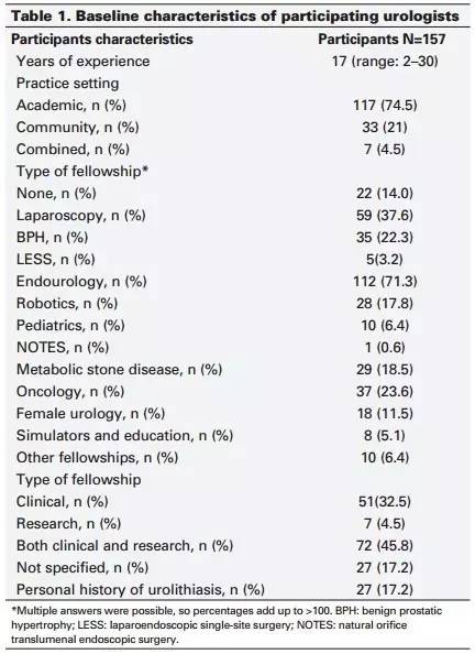 研究組通過世界腔道泌尿外科學會臨床研究辦公室(CROES)向協會成員發放了兩份調查問卷,收集相關統計數據。第一份調查問卷的主要內容是:假設泌尿外科醫生本人就是尿路結石患者,在10種不同的病情下,他們分別會選擇哪種治療方案?第二份調查問卷在8個月后進行,主要內容為:假設有一位尿路結石患者求助,在10種不同的病情下,泌尿外科醫生會向患者推薦哪種治療方案?