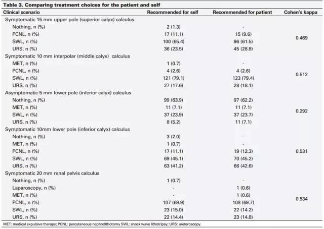 來自38個國家的泌尿外科醫師對兩項調查問卷的回復率分別為78%(160/205)和84%(172/205)。受訪者的平均手術經驗時限為7年(2-30)。共有117(75%)名泌尿外科醫生為教學醫院的醫生。盡管泌尿外科醫生向患者推薦的治療方案與假想自己為患者時所推薦進行的治療方案并不完全吻合。但整體而言,無論是針對自己還是患者,體外碎石與輸尿管鏡(URS)技術都是最受推崇的方案;藥物排石(MET)與腹腔鏡手術是推薦最少的方案。
