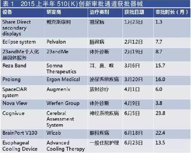 低風(fēng)險的器械通常是通過510(k)通道審批,是另一條更快捷的新型醫(yī)療器械審批通道(de novo clearance),開放給而那些與以往的技術(shù)差別很大的設(shè)備。2015上半年通過創(chuàng)新醫(yī)療器械審批程序的器械有10個,僅略低于以往年平均值。
