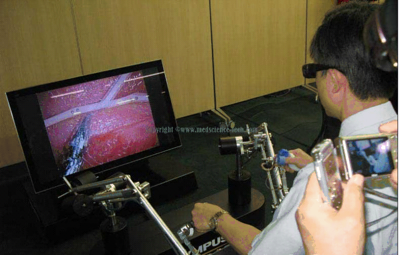 使用此次開發(fā)的機(jī)器人系統(tǒng),外科醫(yī)生不直接操作插入體內(nèi)的專用器械,而是通過主動輸入裝置間接操作專用器械(頂端準(zhǔn)確裝有專用手術(shù)器械的小型機(jī)器手)。因此,不會將執(zhí)刀醫(yī)生的手部抖動傳遞給手術(shù)器械。并且,在醫(yī)生直接操作器械的傳統(tǒng)內(nèi)窺鏡手術(shù)中,內(nèi)窺鏡畫面上看到的是鏡像畫面,也就是說,看到的器械的動作是與實際相反的,而采用該機(jī)器人系統(tǒng)則可以避免這種鏡像動作。