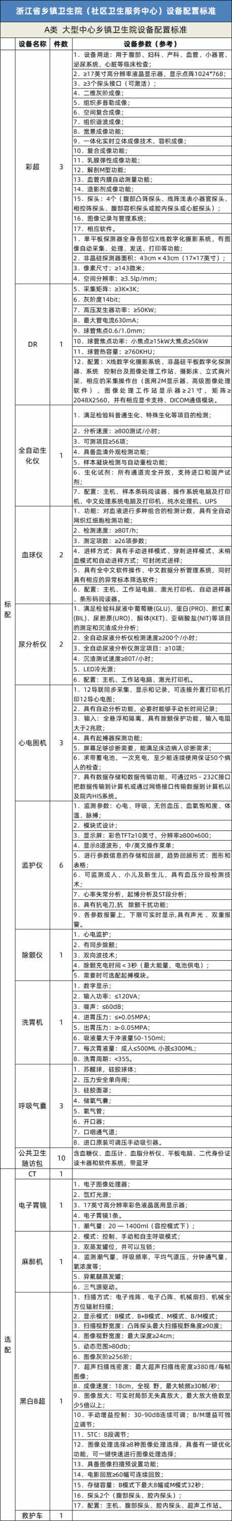 縣級醫院對醫療設備的需求大致如此。鄉鎮衛生院目前的設備配置標準,我們可以參考一下浙江省: