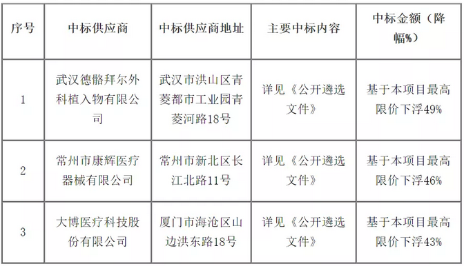 上述公告顯示,大博醫療、常州市康輝醫療、武漢德骼拜爾三家企業中標,中標價格基于項目最高限價分別下降43%、46%和49%。