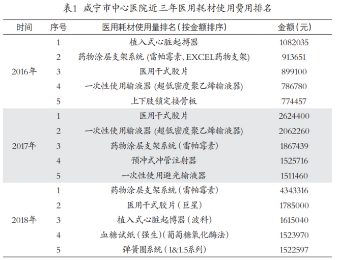 湖北科技學院和咸寧市醫保局曾發布文章,公布這樣一組數據:以全市最大公立醫療機構咸寧市中心醫院為例,2016-2018年醫用耗材使用總費用分別為7099.17萬元、7128.02萬元、11128.33萬元。2017、2018年較2016年分別增長4.06%、56.75%。
