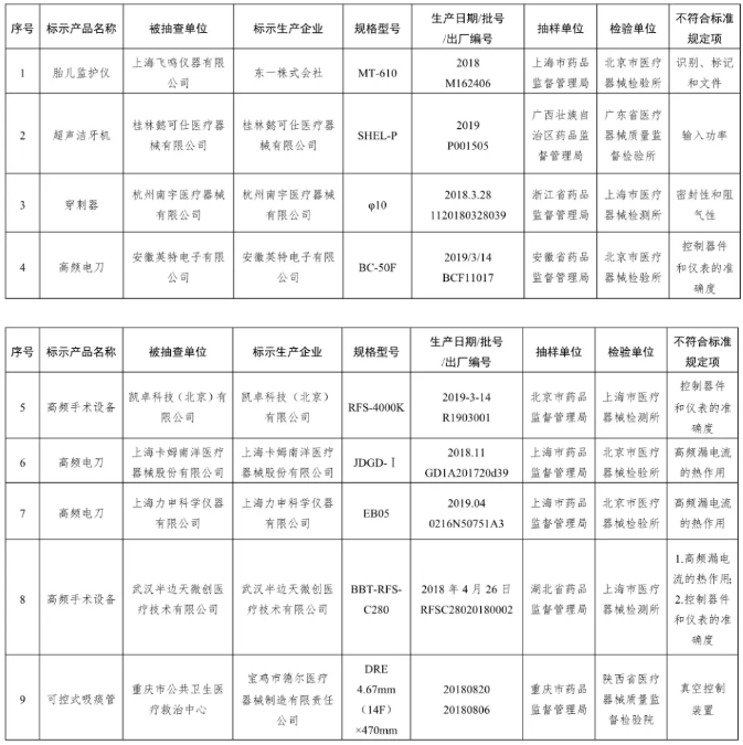 為加強醫療器械質量監督管理,保障醫療器械產品使用安全有效,國家藥品監督管理局組織對超聲多普勒胎兒監護儀、高頻手術設備、呼吸道用吸引導管(吸痰管)等10個品種的產品進行了質量監督抽檢,共34批(臺)產品不符合標準規定。具體情況通告如下: