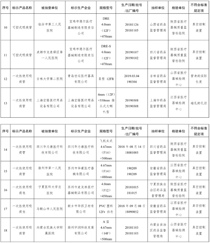 (五)呼吸道用吸引導管(吸痰管)11批次產品:寶雞市德爾醫療器械制造有限責任公司、青島世運醫療器具有限公司、上海宏隆醫療用品設備有限公司、四川華力康醫療科技有限公司、蘇州市華豪醫療器械有限公司、蘇州市麥克林醫療器械制品有限公司、新鄉市華西衛材有限公司、揚州宇潤科技發展有限公司、億信醫療器械股份有限公司生產,涉及真空控制裝置、管身的實際長度、端孔的孔徑不符合標準規定。