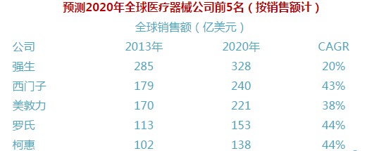 據(jù)預(yù)測(cè):全球醫(yī)療器械公司到2020年競(jìng)爭(zhēng)格局將會(huì)依照這樣的排名——強(qiáng)生居首,西門子、美敦力、羅氏、柯惠分列第二至第五位。