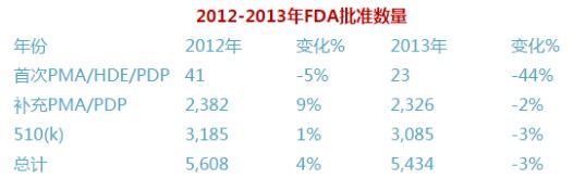 另一個(gè)變化是在監(jiān)管方面,F(xiàn)DA希望能夠比之前批準(zhǔn)更多的器械產(chǎn)品。FDA有很大的動(dòng)力這么做:報(bào)告顯示,2013年FDA僅僅批準(zhǔn)23個(gè)首次上市前審批(PMA),這個(gè)數(shù)字比前一年少了44%。