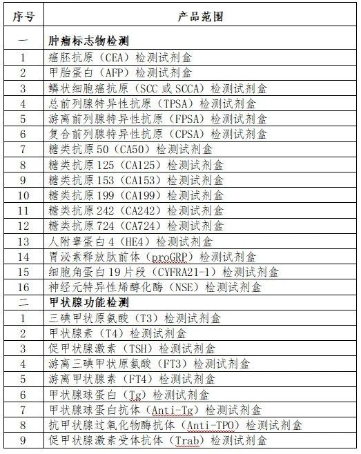 根據(jù)《通知》,此次集采范圍為腫瘤標(biāo)志物檢測(cè)產(chǎn)品十六項(xiàng)(化學(xué)發(fā)光法、流式熒光法、時(shí)間分辨免疫熒光法等)與甲狀腺功能檢測(cè)產(chǎn)品九項(xiàng)(化學(xué)發(fā)光法),具體如下: