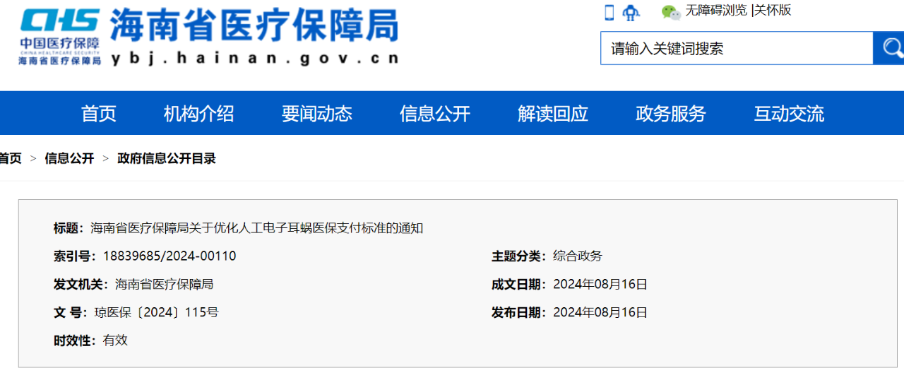 近日,海南醫保局發布《關于優化人工電子耳蝸醫保支付標準的通知》(完整見文末),自印發之日起執行,試行期1年。