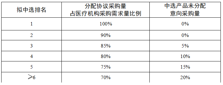 3、依據文件,同一競價單元中選企業按中選排名順序,排名第一(競價比價價格最低)的產品可獲得100%的意向采購量,排名第二和第三的產品分別獲得90%和85%的意向采購量,依此類推。