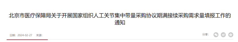 此外,北京、四川等地也啟動了人工關節(jié)集中帶量采購協(xié)議期滿接續(xù)采購需求量填報工作。
