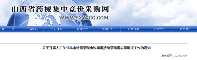 今日(2月28日),上海、山西、內蒙古等多地發(fā)布《關于開展人工關節(jié)集中帶量采購協(xié)議期滿接續(xù)采購需求量填報工作的通知》。